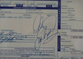 Included with sale are the original sales invoice and owner’s manuals, both of which are signed by Dale Earnhardt.  A copy of the original title, also bearing Earnhardt’s signature, will also be provided with sale.