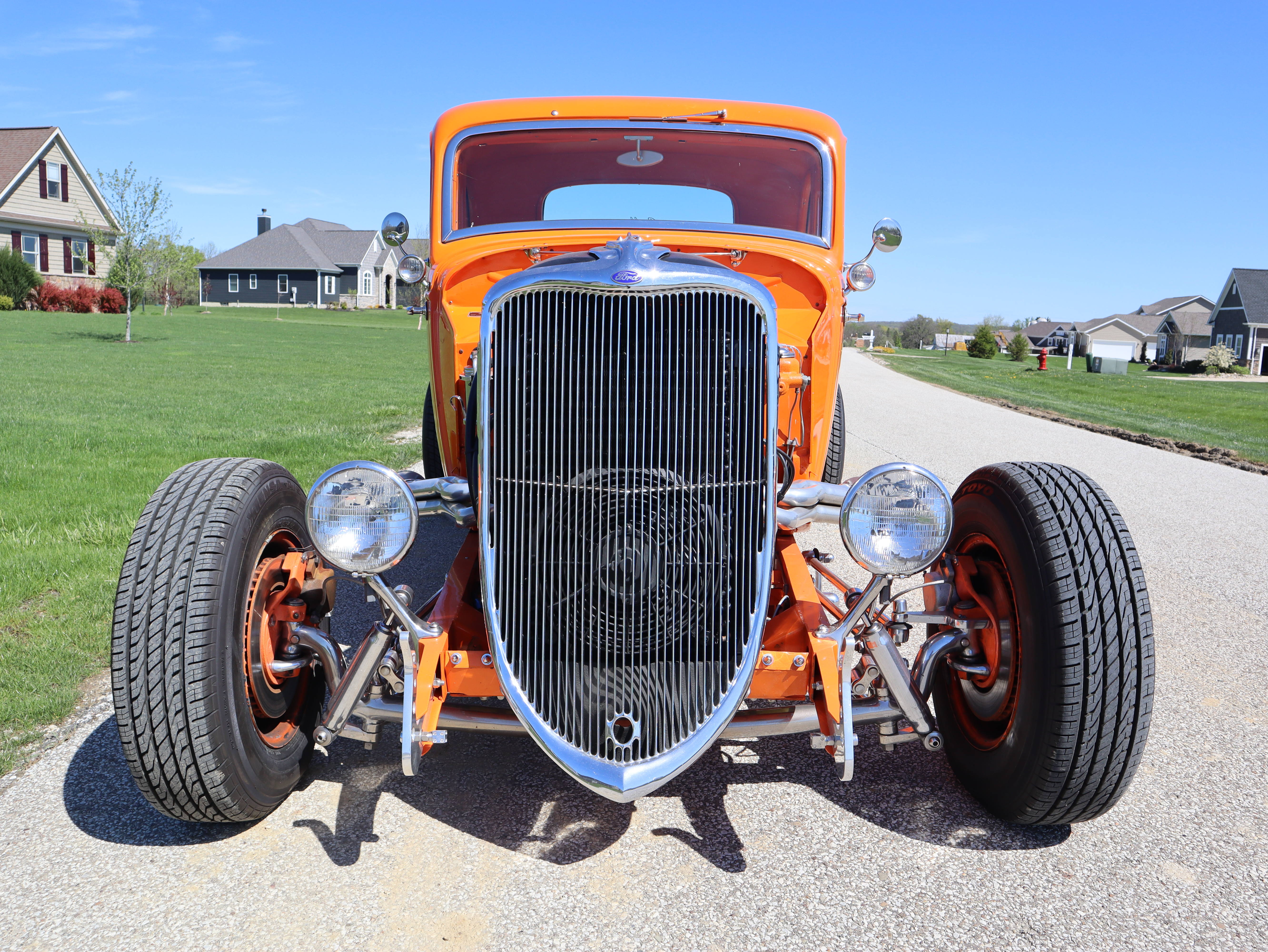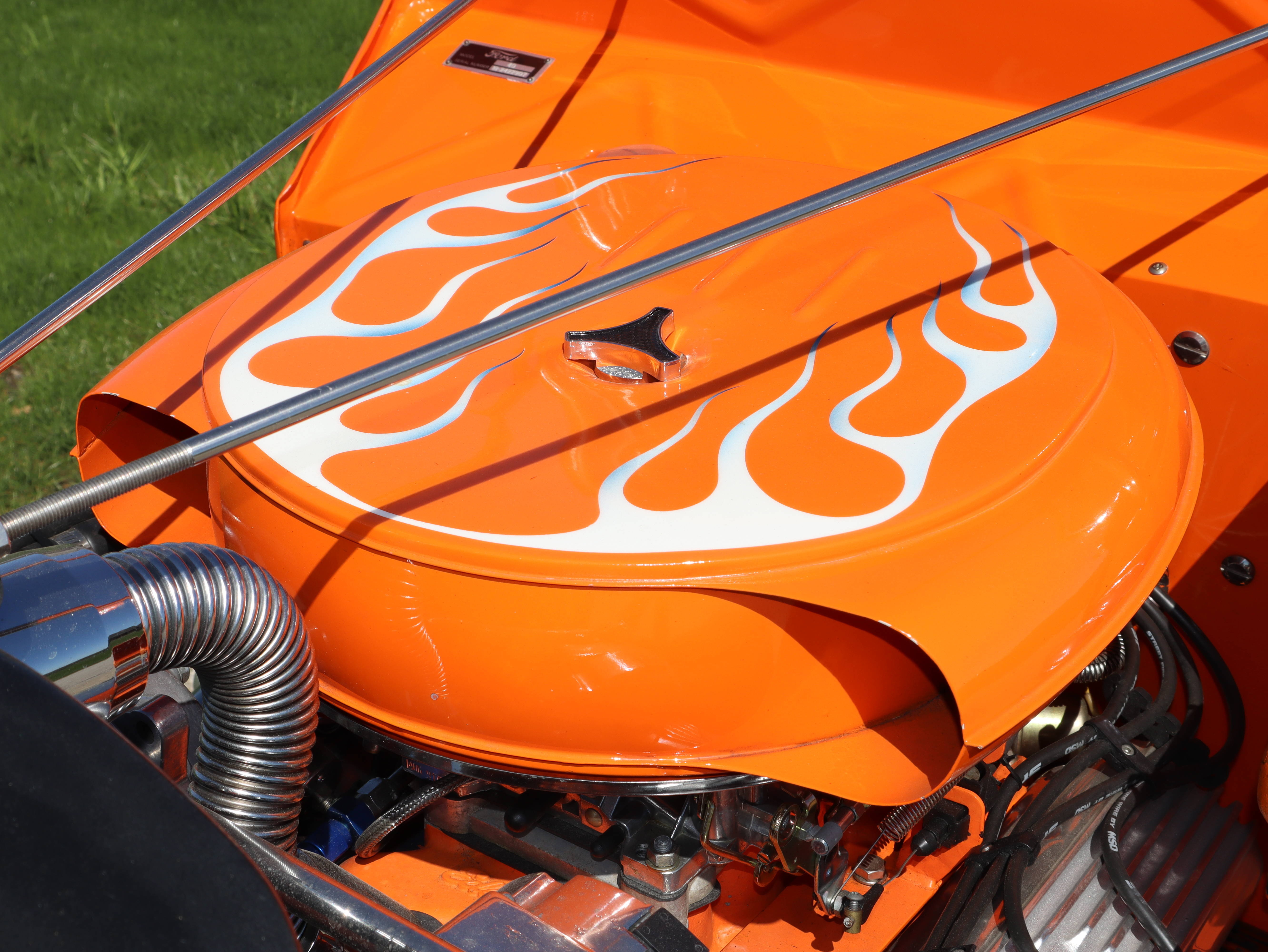 Finished in Monarch Orange, this looker’s finish has a nice luster that is further enhanced by its distinctive grille and other brightwork.  A set of deep dish wheels with baby moons and trim rings provide additional pop, as do its wide white wall tires.  Its heavily chromed engine compartment, complete with a 1950s style air cleaner, completes the package.