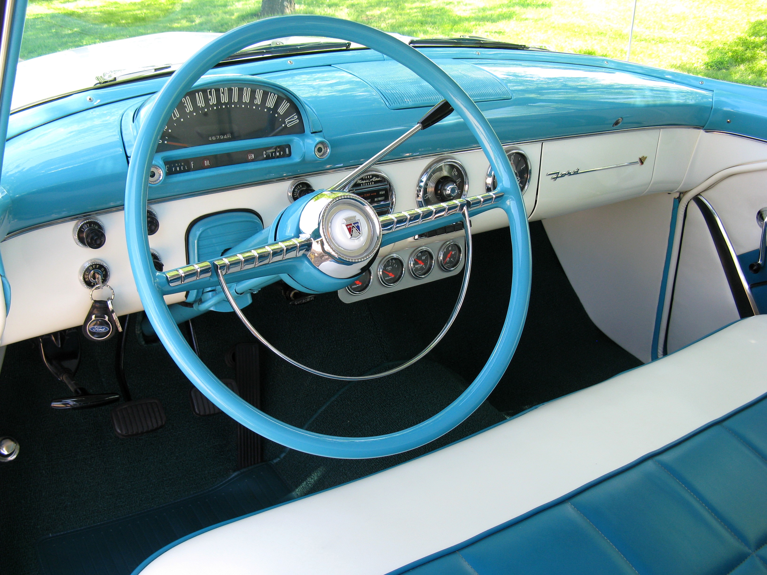 Turquoise & White 2-tone exterior & interior ... New chrome ... Polished stainless steel ... 312 CID V-8 30 over ... Mild cam ... 3-speed manual ... Beautifully restored ...