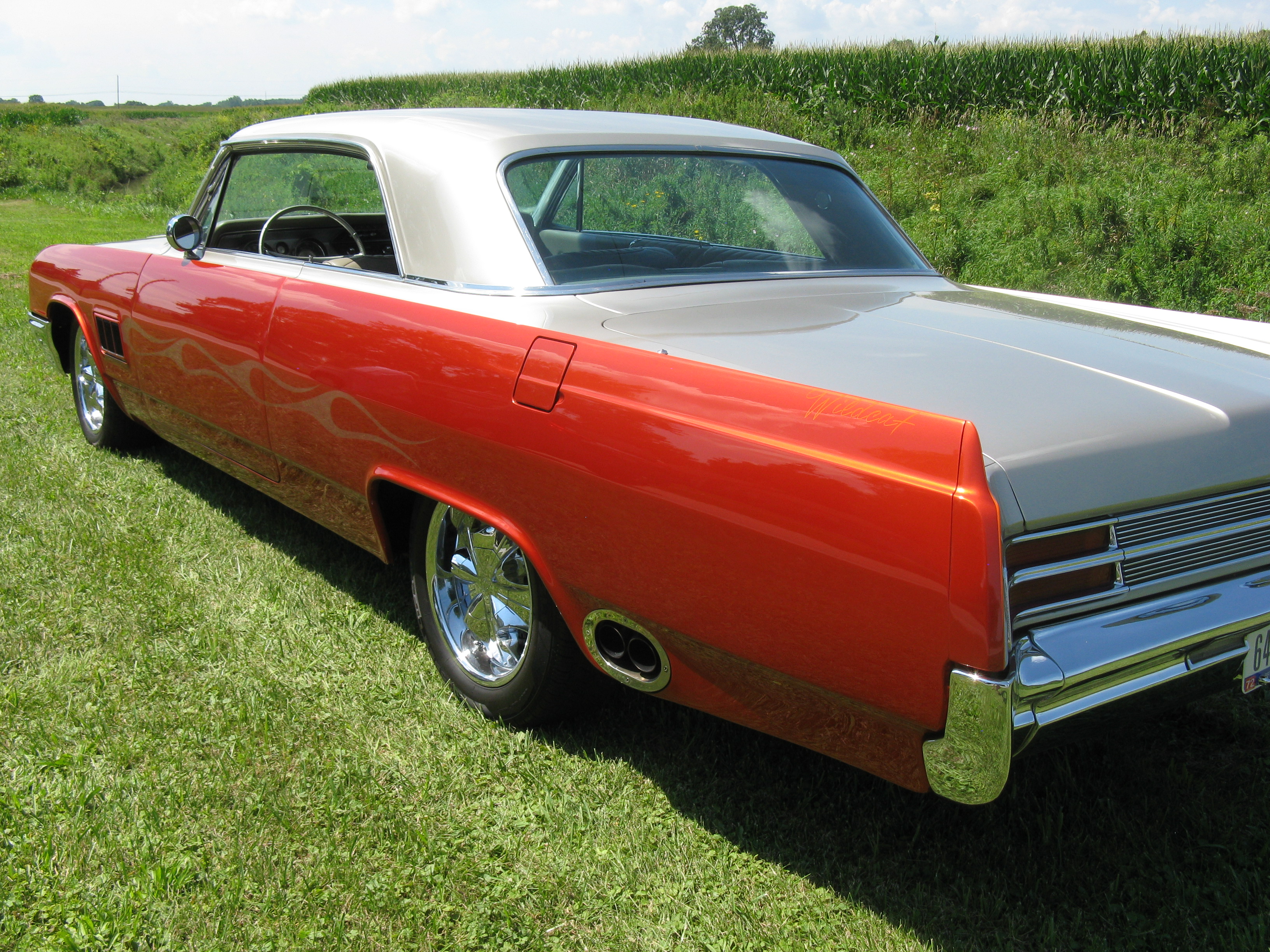 Talk about eye appeal!  Finished in Prowler Orange and Ferrari Silver, this Wildcat’s finish has a mirror-like finish.  Its two-tone finish is neatly separated by orange hand-painted pinstriping.  You’ll also appreciate its silver ghost flames emanating from the custom front fender vents, which beautifully echo the color of the top half of the car.  Rear fender side ported dual exhaust coves also add a unique touch, as does its 1964 Thunderbird hood scoop—a feature so perfect on this car that it looks like it could have come from the factory.  Shaved door handles and 17” Verde Nasa chrome wheels complete the look.  All of the chrome and brightwork on this car is in excellent condition.