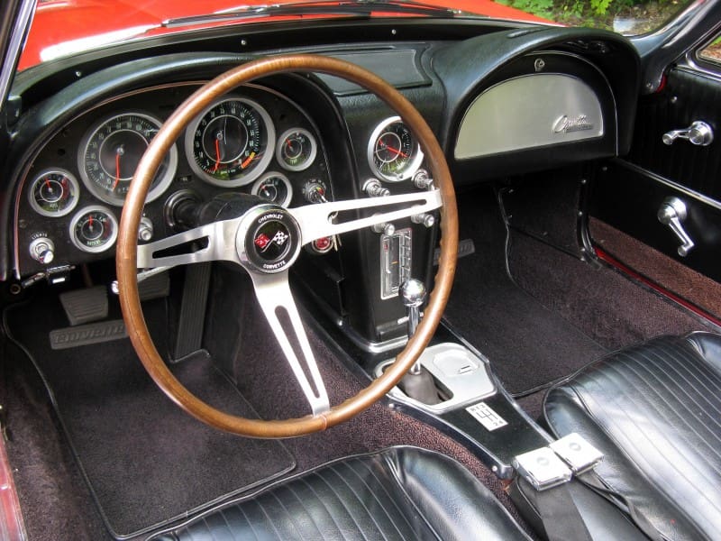 This gorgeous 1964 Corvette Stingray convertible is finished in Riverside Red and features a White soft top that is in excellent condition.  The finish has a beautiful luster that is further accentuated by chrome and brightwork that is also shows nicely.  You’ll also appreciate its aftermarket knock-off wheels, which contribute to its gorgeous presentation.  Newer radial tires afford comfortable cruising.